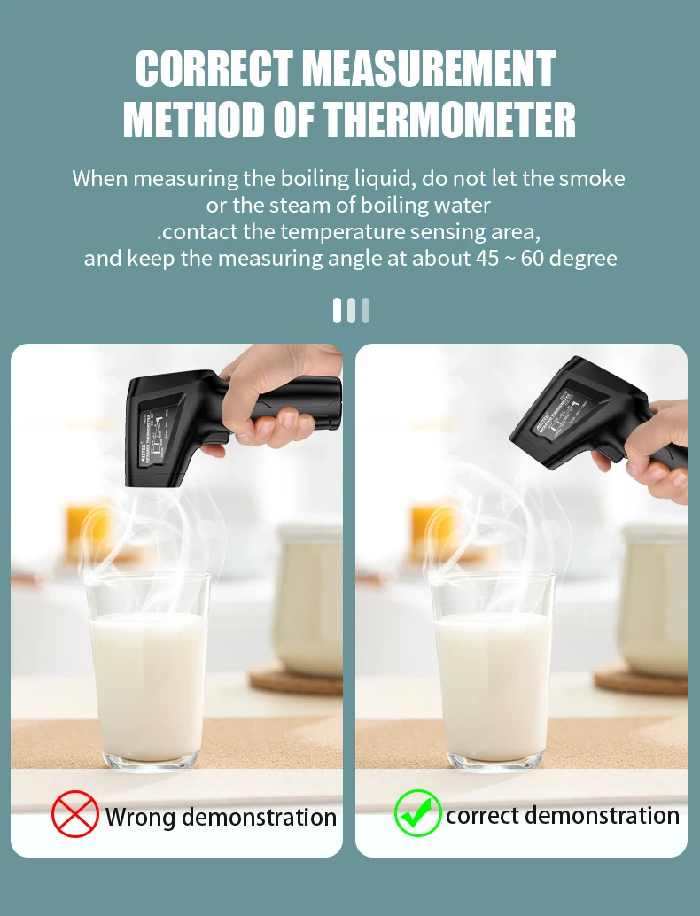 При измерении кипящей жидкости не допускайте попадания дыма или пара кипятка в зону измерения температуры и держите угол измерения около 45 ° ~ 60 °