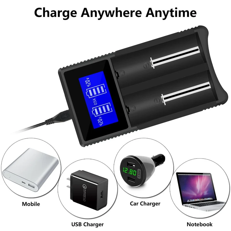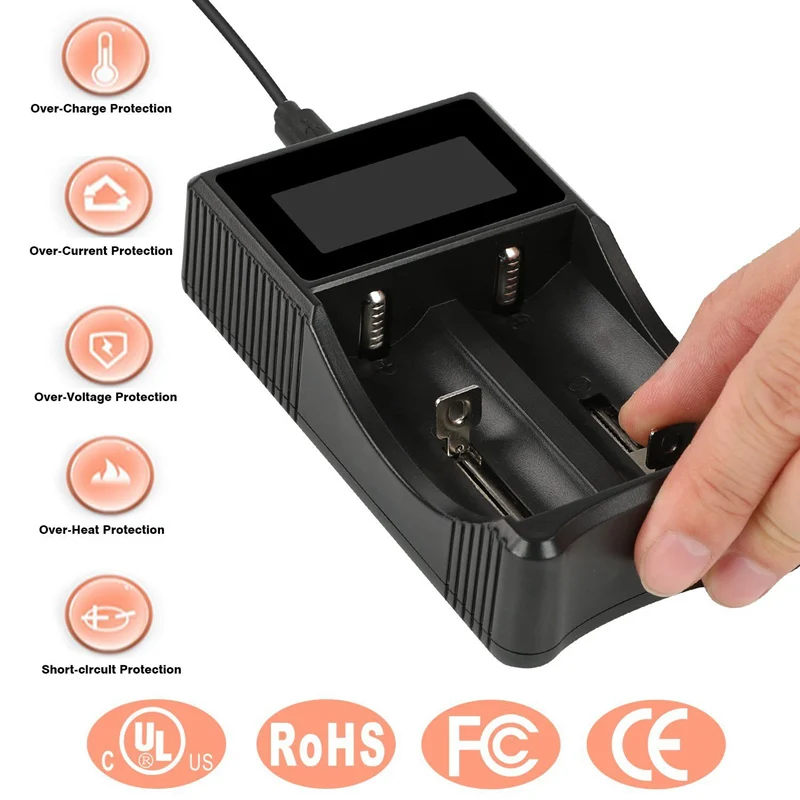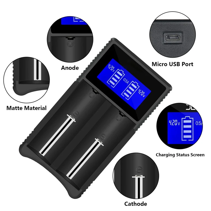 Совместим с литий-ионными батареями 18650 18490 18350 17670 17500 (RCR123), 16340 Ni-MH/Ni-Cd A AA AAA батареи и 3,7 V литиевая батарея и так далее. Встроенная ЖК-панель четко отображает параметры зарядки и ход работы; Автоматически определяет состояние заряда батареи и выбирает соответствующий режим напряжения и заряда; Автоматически останавливает зарядку при завершении;