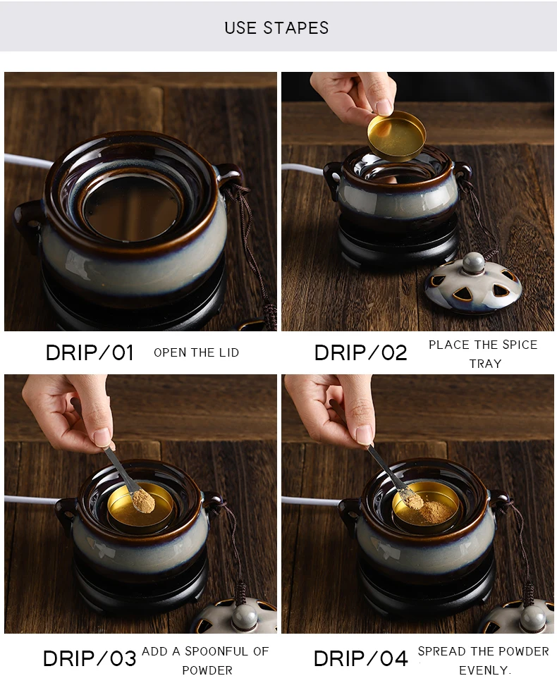 1. Эфирное масло, температура обычно регулируется до 100 °, и время устанавливается до 2 часов. 2. Ароматный порошок, температура обычно регулируется до 200 °, время устанавливается до 4 часов. 3. Деревянный блок (например: сандаловое дерево), температура обычно регулируется до 240 °, и время устанавливается до 4-5 часов. 4. В процессе использования порошка и деревянных блоков, пожалуйста, положите специи в блюдо, что удобно для очистки и хорошо влияет на ароматерапию.