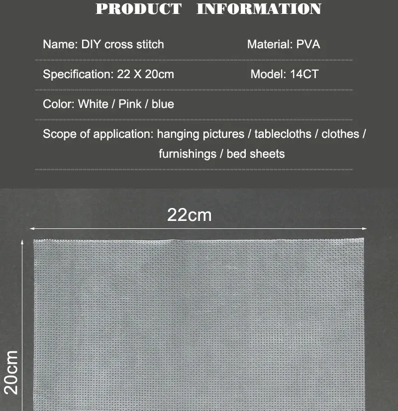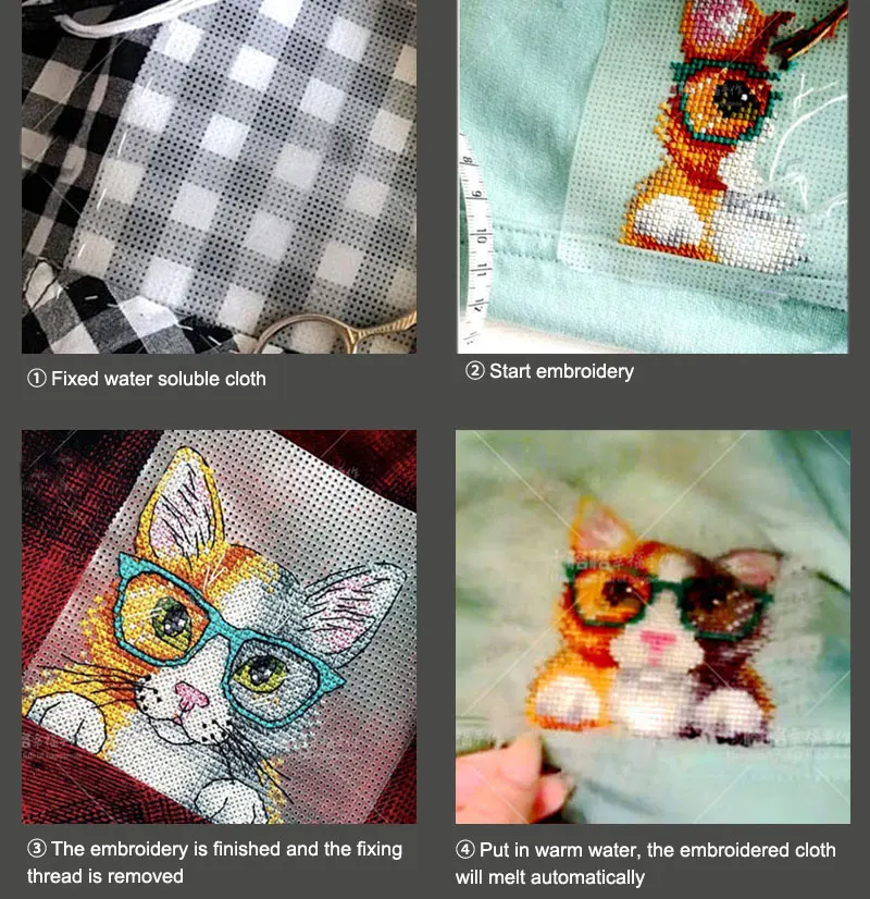 Водорастворимая ткань, вышивка крестиком, которая может быть вышита в любом месте, нарушает обычные характеристики вышивки. Он может быть вышит по желанию. Она может быть расшита везде, где вы хотите вышивать. От висящих картин до скатертей, от мебели до всех видов пододеяльников и простыней, он широко используется. Его Магия происходит от использования своего рода вышитой ткани, называемой «водорастворимой тканью». Как следует из названия, Водорастворимая Ткань растворяется в воде. Закрепите кусочек водорастворимой ткани на предмет, который будет вышитым, и затем он может быть вышитым как обычный крестиком. После этого Водорастворимая Ткань смывается, а оставшаяся вышивка остается на вышитом предмете. Инструкции по производству 1. Сначала используйте нить для вышивки, чтобы зафиксировать водорастворимую ткань вокруг объекта, чтобы быть вышитым 2. Вышивать в соответствии с рисунком. 3. После вышивания картины, нить для вышивки вокруг фиксированной области будет удалена, а затем область для вышивки будет замачиваться в воде. 4. Около 5 минут, Водорастворимая Ткань будет полностью растворена в воде, а затем можно высушить вышивку.