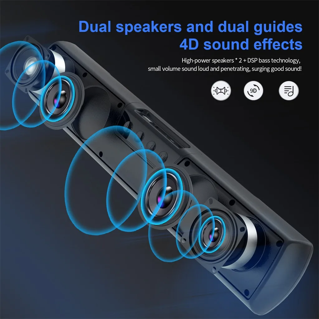 Версия Bluetooth: BT 5,0 Внешний интерфейс: Micro USB; TF Выходная мощность: 2*10 Вт Цвет изделия: черный SNR:≥ 85 дБ Напряжение зарядки: 5 В Канал: стерео Протокол Bluetooth: A2DP/AVRCP/HSP Материал: АБС + алюминиевый сплав Емкость аккумулятора: 3600 мАч Поддержка TF: MP3, WAV Тип хранения: максимальная емкость TF Не превышает 32 г Размер изделия: 42x8,3x4,5 см Вес изделия: 642 гПосылка:
